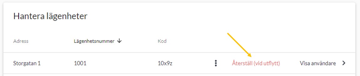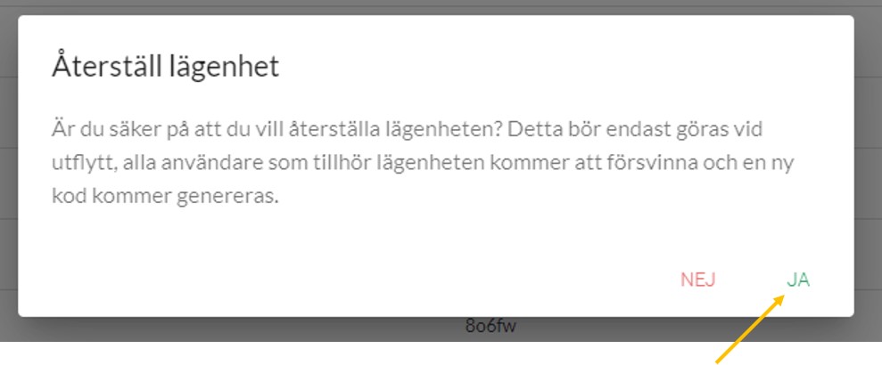 När en lägenhet byter ägare ska kontot som är associerat med lägenheten återställas så att de gamla användarna tas bort och det genereras en ny lägenhetskod.