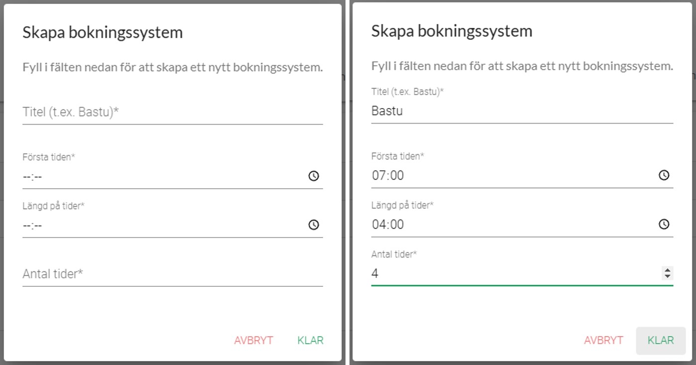 3. Fyll nu i vad bokningssystemet ska gälla, t.ex. Bastu. Välj sedan vilken tid på dagen den första bokningsbara tiden börjar, hur långt varje pass är samt hur många sådana det ska finnas per dag. I vårt exempel vill vi skapa ett bokningssystem för en bastu. Första passet ska börja kl. 7 på morgonen, man ska få boka bastun 4h åt gången och det ska finnas 4st pass per dag. Med våra inställningar har vi nu skapat ett bokningssystem för en bastu med tiderna 07:00-11:00, 11:00-15:00, 15:00-19:00 och 19:00-23:00.