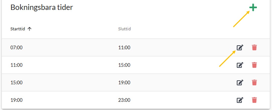 Det går också att ändra eller ta bort individuella tider genom att klicka på pennsymbolen resp. papperskorgen.