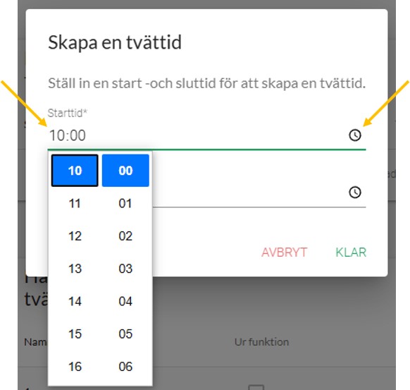3. För att börja ställa in tvättider klickar ni på plustecknet i fönstret Hantera tvättider. I rutan som kommer upp väljer ni sedan önskad starttid och sluttid. Ni kan antingen klicka på den lilla klockan för att få upp en rullista med tider eller klicka direkt i fältet för att fylla i tiden manuellt. När alla tider är inlagda ska sidan (webbläsaren) laddas om för att bekräfta ändringarna.