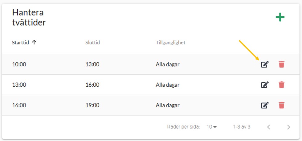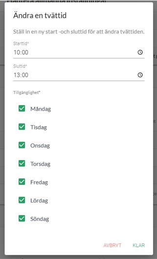 4. När ni laddat om sidan så ser ni alla tider inställda i listan med tillgänglighet Alla dagar. Här kan ni, om ni vill, välja att ändra vilka dagar en tid ska gälla, något som kan behövas om ni t.ex. har längre eller kortare helgpass eller om tvättstugan inte ska användas alls vissa dagar och därför inte ska ha några tider. För att ställa in detta klickar ni på pennsymbolen och väljer sedan dagar i listan som kommer upp. Viktigt: Om ni vill ändra tider på en tvättstuga som redan är igång med bokningar måste ni kontakta oss, annars uppstår det problem med befintliga bokningar.