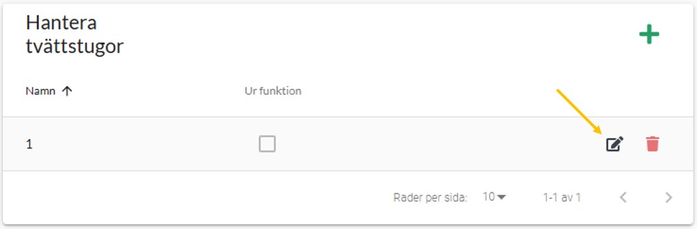 6. Om det uppstår problem med tvättstugan och ni behöver stänga av bokningen kan ni klicka på pennfunktionen och sedan bocka i Ur funktion. Här finns möjligheten att ändra namn på tvättstugan men det är viktigt att detta inte görs, då detta påverkar bokade tider. Kontakta oss för hjälp i så fall.