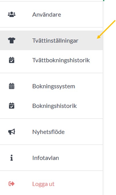 1. Logga in på adminsidan, se guide. När ni loggat in hamnar ni direkt i menyn Användare. Välj nu menyn Tvättinställningar.
